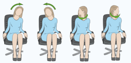 Most people who sit at a desk know what it’s like to have a sore neck, aches, stiffness, and even neck-related headaches. Regular motion may reduce this problem. Sit with your neck tall and your head facing forward. First, turn your head to the left as far as is comfortable. Hold for 10 seconds. Then turn your head to the right, hold for 10 seconds. Next, bend your left ear toward your left shoulder. Hold for 10 seconds. Then repeat to the right. Now, look up to the ceiling, then down to the ground. Again, hold each movement for 10 seconds.