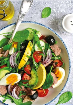 3. Combine tuna, salad leaves, avocado, cucumber, tomatoes, onion, olives and parsley in a large bowl.